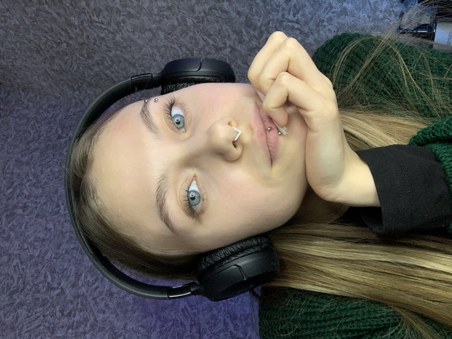 A young female subject, with long light-brown hair and blue eyes, is depicted in a close-up, chest-up shot. She wears black over-ear headphones. Distinct facial piercings include a V-shaped septum ring, two horizontal barbells below the lower lip, and two barbells above her left eyebrow. She is dressed in a dark green knitted sweater over a black long-sleeved shirt. Her right hand supports her chin, with fingers gently curled. The background is a dark, textured wall, suggestive of an indoor environment. A white container is partially visible in the lower right corner of the frame.