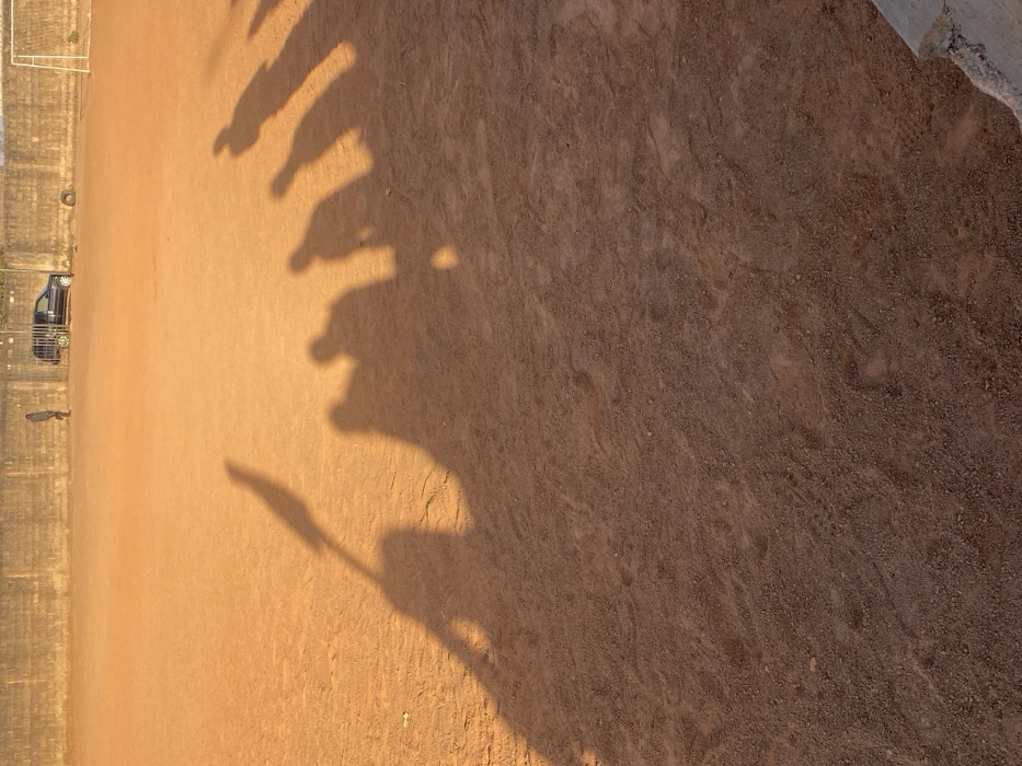 An aerial perspective displays a patch of earth, varying in color from tan to dark brown. The left side of the image is lighter, revealing a car parked along a wall with an open space. Shadows of multiple individuals are cast across the ground, extending diagonally from the left towards the upper right corner. The texture of the earth shifts from smooth on the left to rougher and more textured on the right.