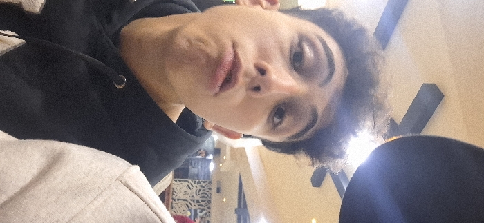 A young person with dark, curly hair takes a selfie. The individual has light skin, full lips, and dark eyes. The camera is positioned at a low angle, looking up at the subject. They are wearing a black hoodie, and part of a light-colored garment is visible. The background is blurred, revealing elements of an interior space with patterned walls and ceiling fixtures. A light source is also present in the background.