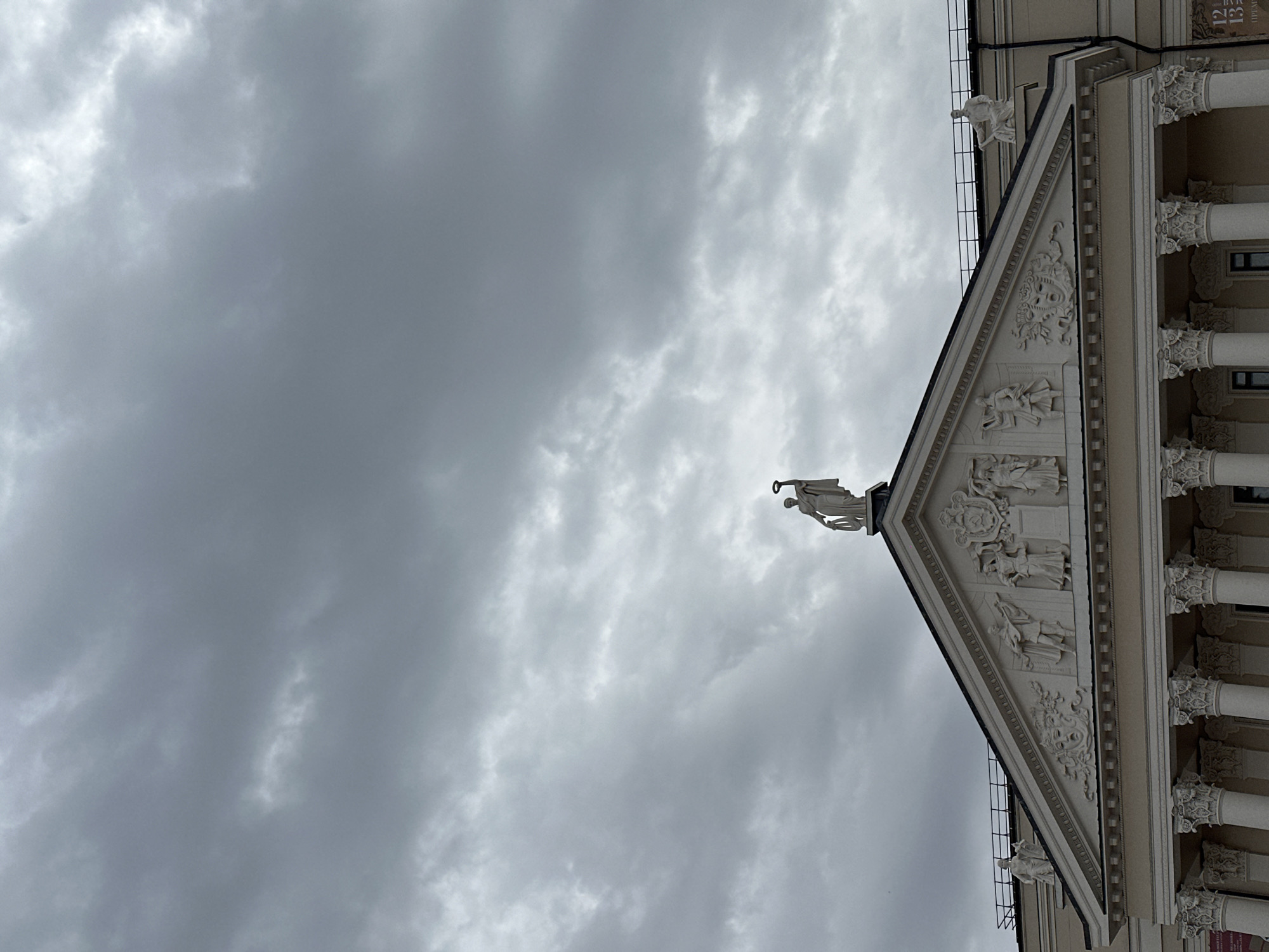 gable of a building in Kazan, Russia, adorned with statues and reliefs under a cloudy sky. A statue of a woman holding a wreath stands atop the apex of the gable. Below, the gable is decorated with a series of sculptural reliefs depicting figures and scenes. The building's facade features Corinthian columns with ornate capitals. The sky is overcast with dark grey clouds.
