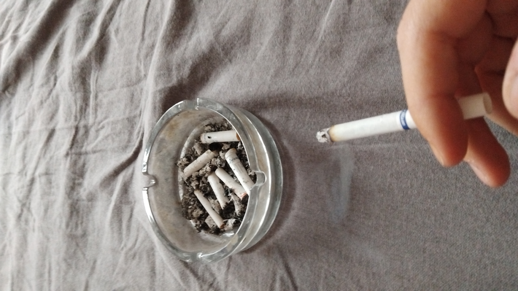 The scene is located in Troyan, Bulgaria. The image captures a close-up, high-angle perspective of a glass ashtray filled with cigarette ash and multiple extinguished cigarette butts, resting on a crumpled light brown or grey fabric surface. Below and to the right of the ashtray, a hand with light skin tone holds a lit cigarette with a white filter and a blue band near the filter. Wisps of smoke are visibly emanating from the burning tip of the cigarette. The background consists entirely of the same textured fabric, exhibiting folds and creases.