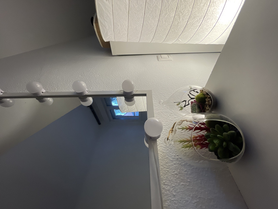 The image displays an indoor domestic scene located in Torrelodones, Spain. In the foreground, a white, flat surface, likely a dresser or table, holds two clear glass terrariums. The left terrarium, larger and oval-shaped, contains a green succulent, black substrate, and red/orange artificial spiky plants. The right terrarium, smaller and teardrop-shaped, features a green spherical plant, gravel, and dark artificial branch elements. Behind these, a rectangular mirror with a white frame is vertically oriented, featuring a strip of five illuminated globe-style vanity lights on its right side. The mirror reflects an exterior window, a dark horizontal air conditioning unit mounted above the window, and a section of a white, tiered paper lantern floor lamp. The walls are white and textured. To the right of the mirror, a white light switch is visible on the wall. Further to the right and occupying the extreme right edge of the frame, the illuminated white paper lantern floor lamp stands. The upper right portion of the image shows an angled white ceiling or wall, indicating a sloped architectural feature. No individuals or active interactions are present in the scene.