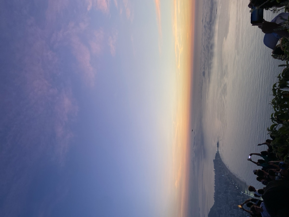 An aerial view showcases a coastline at dusk. A blend of blue, orange, and white hues paints the sky. The sea mirrors the sky, reflecting a gradient of colors. A city stretches along the coast, gradually disappearing into the horizon. Silhouetted figures stand at the viewpoint, capturing the scene on their phones. Vegetation frames the view, adding a touch of natural beauty to the cityscape.