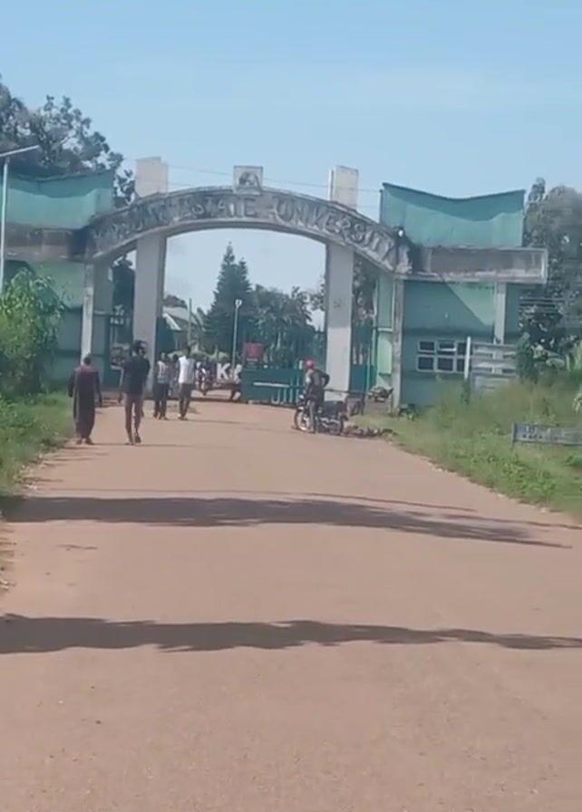 entrance gate to the Adamawa State University in Nigeria. The gate is light green and white, with the university's name inscribed above the archway. A paved road leads up to the gate. Several people are walking towards and through the gate, and a person on a motorbike is also passing through. The sky is blue, and there are trees and shrubs on either side of the road. A sign on the right reads "PUBLIC AREARS".