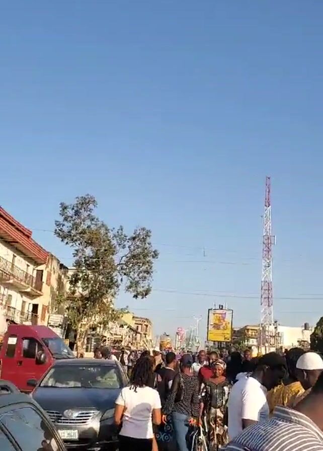 street scene in what appears to be a bustling urban area. People are walking in different directions on a crowded street. Various vehicles, including cars, vans, and possibly buses, are visible in the background, some parked and others moving. The buildings along the street vary in style and appearance. There's a telecommunications tower in the distance. Signs for businesses can be seen, including one that says "FAMOUS COMMUNICATION & DVD PLAZA" and another that says "DOWNLOAD MUSIC, AUDIO & VIDEO, MOVIES." Overall, the scene conveys a sense of daytime activity in a vibrant commercial area.