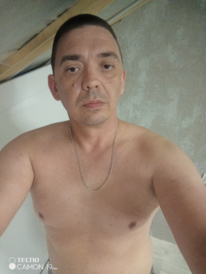The image displays a shirtless adult male, appearing middle-aged, in a medium shot indoors. He possesses short dark hair, a light complexion, and a thin mustache with stubble, maintaining a direct gaze at the camera. A gold-colored, braided link chain is visible around his neck. The background on the left reveals a light-colored door or panel, above which exposed wooden ceiling beams and white electrical conduit are present against an unfinished light-colored ceiling. The background on the right consists of a textured, light gray wall. The specific location within the city of Chaikovsky, Russia, cannot be determined from the visual content of the image.