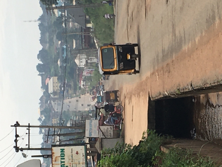The image depicts a street scene in Nkpor, Nigeria, under an overcast or hazy sky