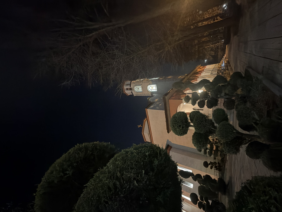 The image displays the Sveti Sedmochislenitsi Church, located at Tsar Ivan Shishman Street 9, 1000 Sofia Center, Sofia, Bulgaria, photographed at night. The church features a white facade with orange-red trim, illuminated by warm artificial lighting emanating from within and external spotlights. A golden Orthodox cross is visible atop the central dome. A tall, multi-tiered bell tower, also lit from within, stands to the right of the main structure. The sky above is uniformly dark. The foreground and areas around the church are landscaped with numerous sculpted evergreen bushes and topiaries of varying heights and shapes. A paved pathway, likely stone or concrete, extends from the lower foreground towards the right side of the image. Along the right edge of the frame, a line of bare deciduous trees stands with visible branches, partially illuminated by an artificial light source originating from the right. No individuals or vehicles are present within the scene.