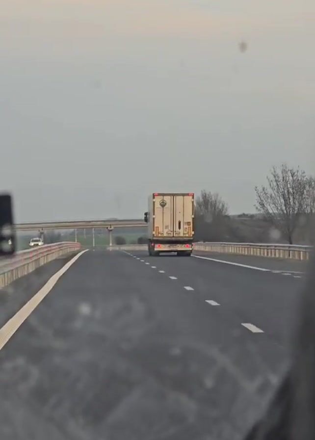 The video, captured from inside a moving vehicle, shows a view of a highway with a large trailer truck in the distance, traveling in the same direction