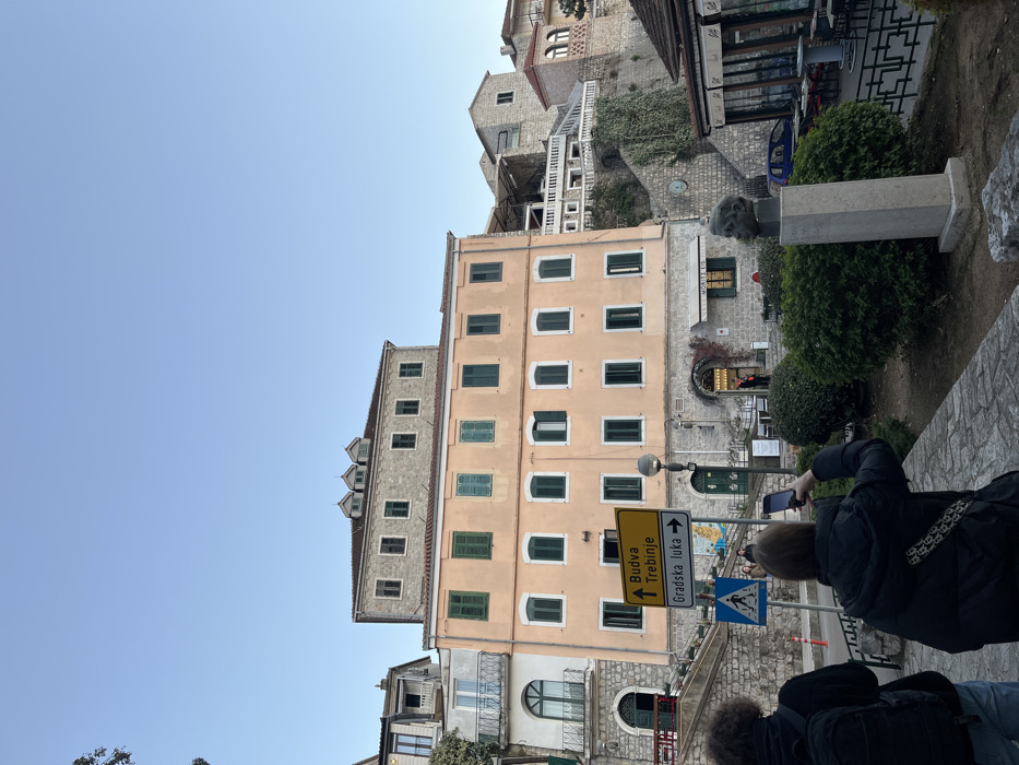 A pale pink building with green window shutters dominates the image. Adjacent to it is a taller gray building with similar window features. Street signs indicating directions to Budva and Trebinje are visible near people, one taking a photo. Behind the buildings, a stone stairway ascends a hill towards additional buildings. Foliage and a bust statue add to the scenery. A bright blue sky fills the upper portion of the shot.