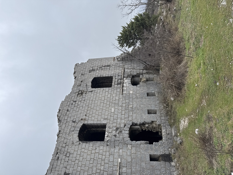 This image depicts the weathered stone ruins of a multi-story structure, likely a fort or large building, situated in Vrela, Montenegro, under an overcast sky. The primary subject is a grey stone wall constructed from rectangular ashlar blocks, exhibiting significant damage and partial collapse, particularly along its uneven top edge. The visible section of the wall features two levels with multiple openings. The upper level displays two prominent arched openings, likely former windows, which are now empty and dark. Below these, a distinct horizontal stone ledge or band runs across the wall. The lower level contains several openings: a large, heavily damaged arched entrance or window on the left, revealing interior rubble and darkness; another smaller, damaged arched opening to its right; and three smaller, rectangular openings, possibly embrasures or narrow windows, two on the left and one further right. The masonry around these lower openings shows considerable deterioration. The structure stands on a gently sloping, sparsely vegetated terrain. A narrow dirt path is visible in the foreground, leading towards the damaged lower-level opening on the left. The ground is covered with patchy green grass, interspersed with dry, leafless thorny bushes and scattered rocks. To the right of the ruins, a cluster of green coniferous trees and additional bare, skeletal trees are visible. The sky overhead is uniformly grey and cloudy. No individuals or specific objects indicating recent human activity are present.