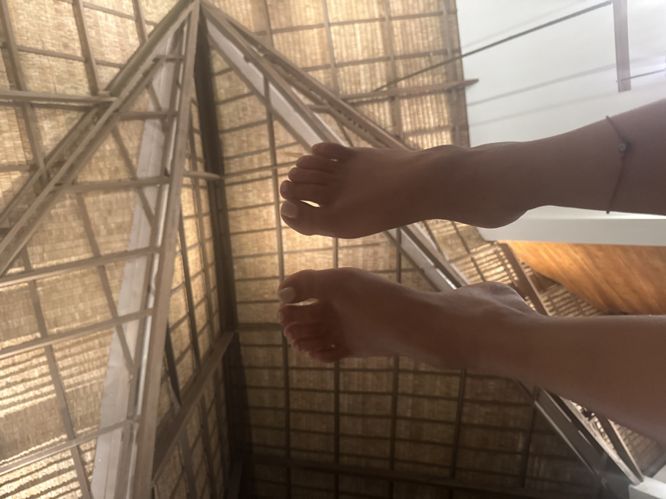 A low-angle photograph captures a pair of bare human feet positioned prominently in the foreground, pointing upwards towards an overhead structure