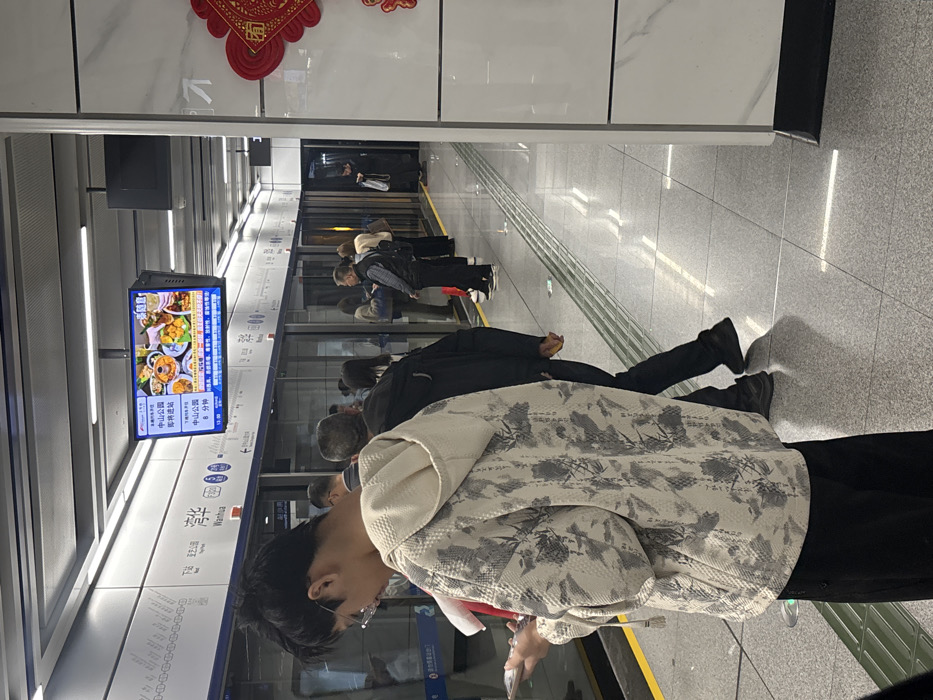 A person in a patterned jacket is standing at a subway station platform, looking at a phone. Several people are lined up to enter a train, their reflections visible in the doors. A screen displays food images and text. The station appears clean and well-lit with signs in Chinese. A red decoration hangs on the wall.