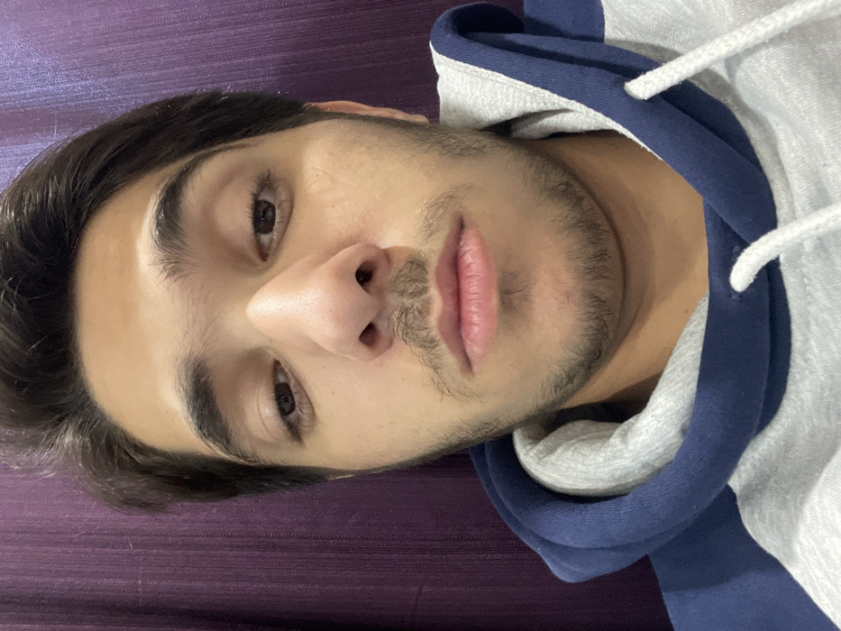 A close-up portrait depicts a young male with dark hair, dark eyes, and a light mustache and stubble