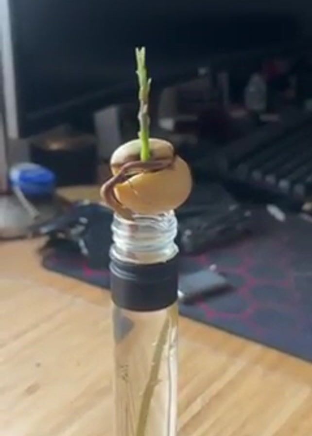 n avocado seed sprouting and growing in a glass tube filled with water. The tube has a black band around the top and a label with text. The avocado seed is split in half and a green sprout is growing upwards, while roots are growing down into the water. The tube is sitting on a wooden surface in front of a computer monitor, keyboard, and other miscellaneous objects. A hand with white nail polish is visible in the shot.