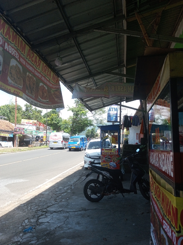 The image depicts a roadside commercial scene during daylight, viewed from under a corrugated metal roof. In the immediate foreground, a cracked concrete pavement is visible, with two dark-colored motorcycles parked on it. Overhead, a large banner displaying images of fried food and text in an Indonesian language, including "SERBA 10..." and "RAZA MINAK," is suspended from the roof structure. To the right, a yellow and red food stall with "MASAKAN PADANG" written vertically on its side is partially visible. Adjacent to it, a blue mobile food stall features a display case with food images and a cartoon chef. Another banner, partially visible to the right, reads "MASRI RASA." A white, spherical light fixture hangs from the corrugated roof. The midground shows a multi-lane asphalt road with a white solid line on its right edge and a broken white center line. Vehicles are present on the road: a white minivan is partially parked on the shoulder, a blue boxy van is further down, and another white van is behind it. An ATM sign (blue with "ATM" text) is visible behind the blue mobile stall, and clothes are hanging nearby. Various other roadside establishments with signs are visible further along the road. The background consists of dense green foliage and trees, with hazy distant hills or mountains under a bright, slightly overcast sky. No prominent individuals or specific human actions are discernible. The linguistic content on the banners ("Masakan Padang") and the type of vehicles suggest this scene is located in Indonesia or a similar Southeast Asian country, contradicting the specified location of Ura-Dozhi, Bhutan.