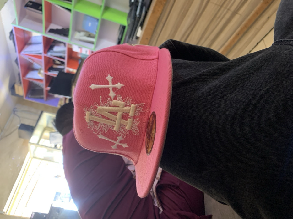 A close-up, high-angle interior shot depicts a pink baseball cap resting on the upper leg of an individual wearing dark, possibly black, trousers. The cap features a flat brim and prominent white embroidery on the front, consisting of the stylized letters "LA" surrounded by intricate floral or leafy patterns, flanked by two white, cross-like symbols. A gold and brown sticker is visible on the cap's brim. In the blurred background, another person is partially visible from the back, dressed in a plum-colored garment. Behind them, brightly colored shelves, predominantly orange-red and lime green, are stocked with various items. A bright light source, likely a window or open doorway, is visible to the left. The scene is an indoor commercial or office environment, located in the city of Jos, Nigeria.