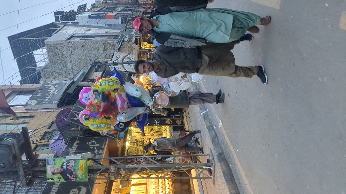 This image captures a commercial street scene in Quetta City Tehsil, Pakistan, during twilight. The foreground features a paved road with two adult males walking towards the right. The individual on the left wears a dark jacket, light brown shalwar, and black athletic shoes. The individual on the right wears a black jacket over a light green shalwar kameez, a red baseball cap, and brown shoes. Behind them, an adult male carries a large cluster of various balloons, including colorful character foil balloons and clear spherical balloons, on his back, proceeding along the raised sidewalk. To the left, a brightly lit jewelry shop displays numerous gold-colored items. A metal utility pole on the left-midground holds a green poster depicting a man in traditional attire with Urdu text, and a sign for "Jewellers" is partially visible. Overhead power lines are present. Multi-story buildings with commercial signage in Urdu/Arabic script line the street. Solar panels are installed on the roof of a building in the background.