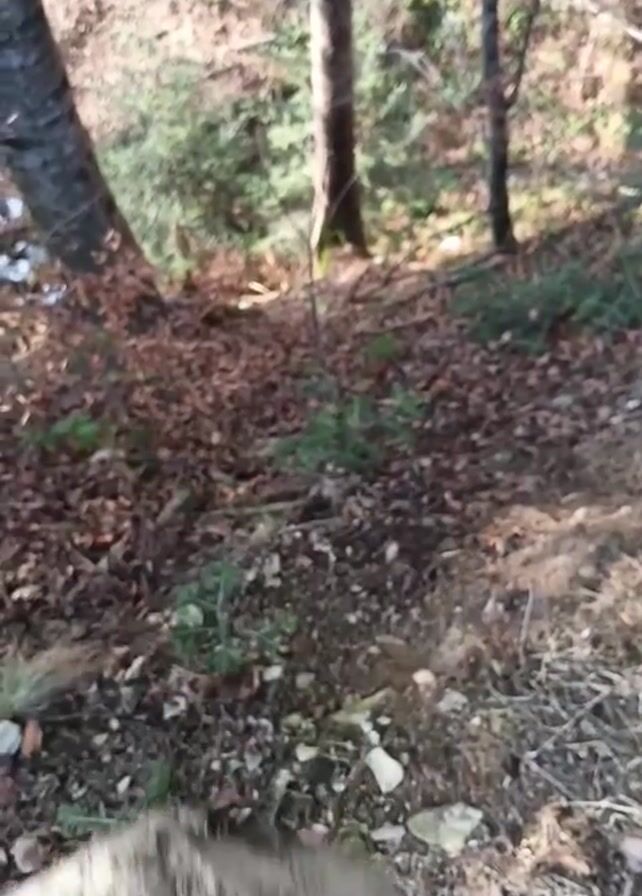 A person wearing a green sweater throws a dirty rock downhill into a forest. The forest has trees, fallen leaves, and some ground cover. The thrower is on a hill with a stream or river below.