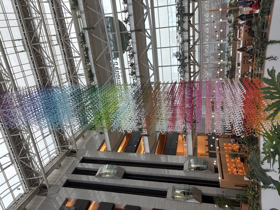 The image depicts the multi-story atrium of the Google Paris headquarters located at 8 Rue de Londres, 75009 Paris, France. A large, vertically suspended art installation dominates the central space, consisting of numerous interconnected, stylized letter-like shapes or symbols. This sculpture exhibits a continuous color gradient, transitioning from purple and blue at the top through greens, yellows, and oranges, to reds and pinks at the bottom. The atrium features a glass roof supported by white metal trusses, allowing natural light to illuminate the space. On the left, a dark grey building facade contains two glass capsule elevators, one with a single individual inside on a lower floor. Multiple open-plan floors with balconies are visible, featuring warm internal lighting and dark railings. On the lower right, a communal area is present. A prominent wooden structure with recessed shelving displaying items is situated near several small, circular tables and chairs. Multiple individuals are seated at these tables, some engaged in conversation, others observing their surroundings. Further right, a long counter, potentially a café or bar, is staffed by individuals, with patrons standing and interacting nearby. Additional people are visible on upper levels and circulating within the lower area. Green foliage in planters is distributed throughout the space, including along the edges of upper balconies and on the ground level. Small pendant lights are strung horizontally across the lower communal area. A partially obscured, mirrored sign is visible on a distant wall on an upper floor.