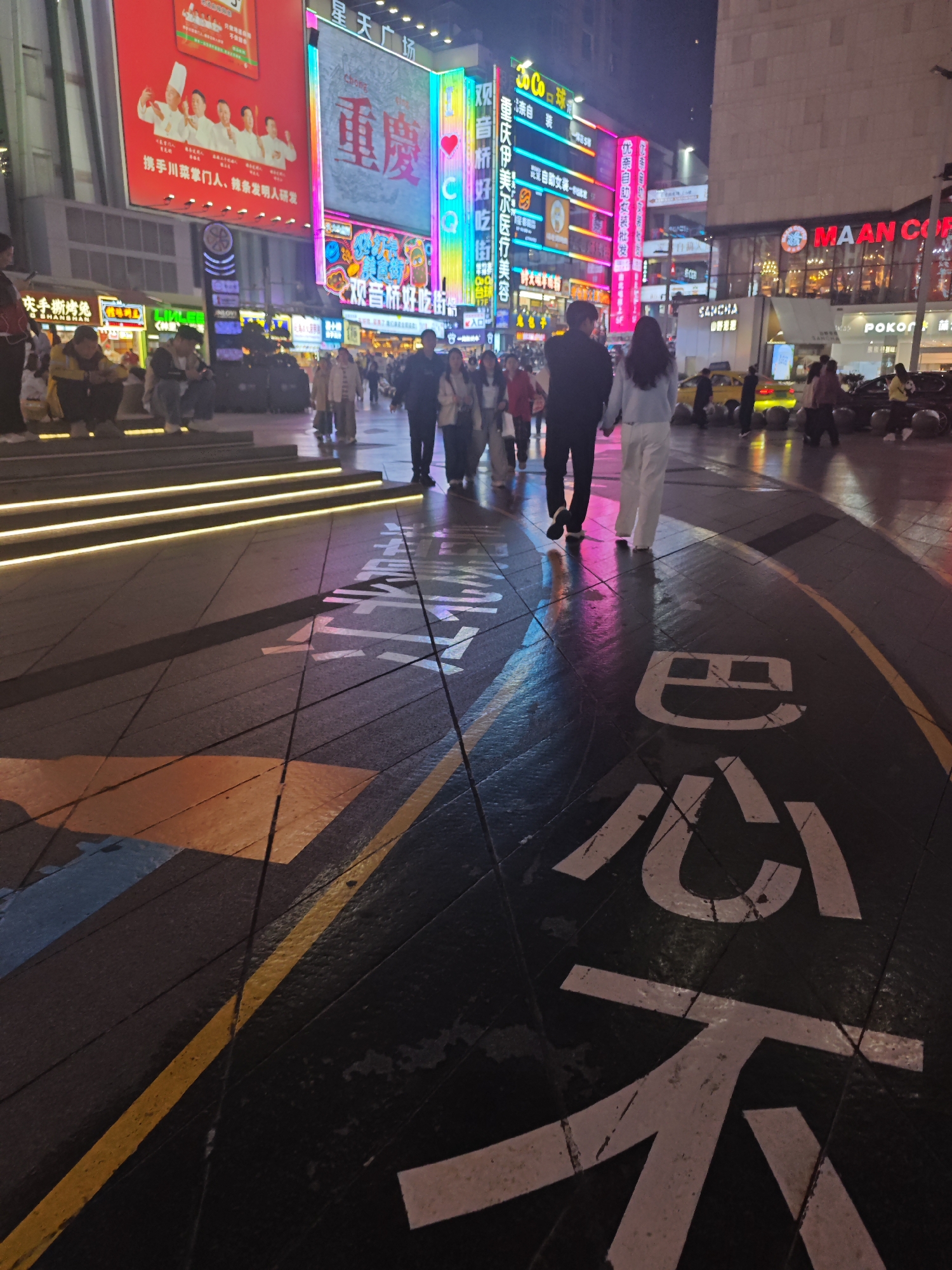 Here is a description of the image: The image captures a bustling street scene in Liangjiang, China, likely at night due to the presence of bright neon signs and street lights. Pedestrians walk along a paved area, including a couple walking away from the camera holding hands. On the ground, there are large white painted Chinese characters. There are various buildings with storefronts and signs in the background, including recognizable brands like "Maan Coffee." The image also shows elements of street design such as lit stairways, painted zones, and pedestrian walkways. The lighting is bright and colorful, creating a vibrant atmosphere.