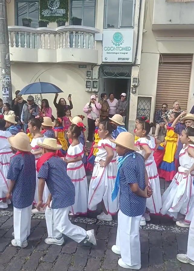 A group of young children, perhaps around eight years old, are kneeling or standing on a cobblestone street. Most of the girls wear white dresses with red and yellow accents, while most of the boys wear dark blue shirts with white polka dots and white pants. All wear hats. They appear to be performing a dance. Behind them and to the sides are a variety of adults watching, taking pictures, and generally observing. A building is in the background with a dental office called "Odontomed". There is some drizzle in the air.