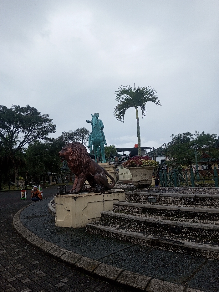 A bronze lion statue sits atop a concrete base near pebble-covered stairs. Behind it, a green equestrian statue stands near a palm tree. A large tree and a building with a dark roof are also visible. The sky is overcast. A person in a brightly colored jacket crouches on the paved ground to the left of the lion. A large stone planter with flowers is perched at the top of the stairs, adding color to the scene.