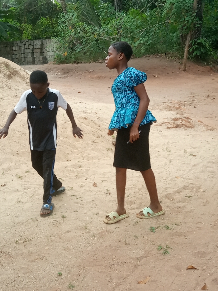 Two children stand on a dirt surface. A boy on the left, wearing a black and white shirt with black pants and sandals, appears in motion with arms outstretched. A girl to the right, wearing a blue patterned blouse, black skirt, and light-colored sandals, stands facing away from the camera. Behind them, a pile of sand is visible next to a stack of concrete blocks. Trees and greenery fill the background.