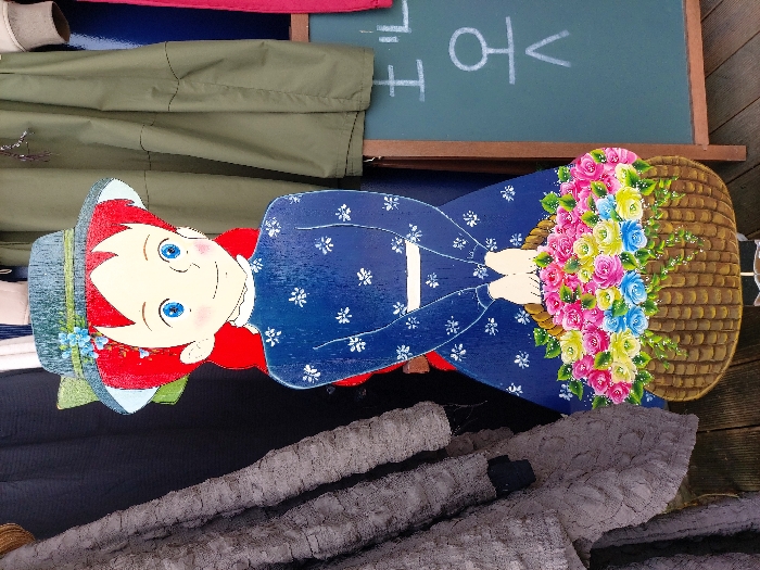 A two-dimensional, life-sized wooden cutout of a female character with red hair, blue eyes, and rosy cheeks stands centrally