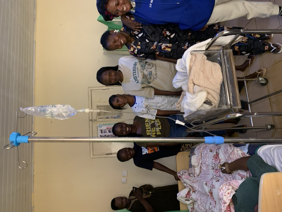 This image depicts a room within a healthcare facility in Jos, Nigeria. The scene features eight individuals, medical equipment, and typical hospital room elements. In the lower-left corner, a person is partially visible lying in a hospital bed with a white and pink floral-patterned duvet. An intravenous (IV) line is inserted into the person's right hand, connecting to a clear bag of fluid suspended from a chrome IV pole. The IV pole stands prominently in the center-left foreground. To the right of the bed and the IV pole, a clear plastic baby bassinet on a chrome wheeled frame contains several folded blankets, primarily beige and white. No infant is visible within the bassinet. Seven other individuals are present. On the far left, an adult male in a brown traditional garment is holding a mobile phone and looking down at it. Six adult females are standing from the middle to the right side of the frame, generally facing the camera. Their expressions range from subtle smiles to broad smiles. Their attire includes a black "SPORTS DAY" t-shirt, a dark green t-shirt with "RIEN" text, a white t-shirt with splatter patterns, a beige "AMSTERDAM" t-shirt, a dark patterned shirt, and a blue hoodie worn by the woman furthest to the right who also has a dark head covering. One woman has her arm around another's shoulder. The background consists of a plain, light-colored wall with two light-colored doors. Posters or signs are affixed to the wall near the doors. Electrical outlets are visible on the wall. A green fabric drape or curtain is partially visible in the upper-right corner. The floor is a light-colored tile.
