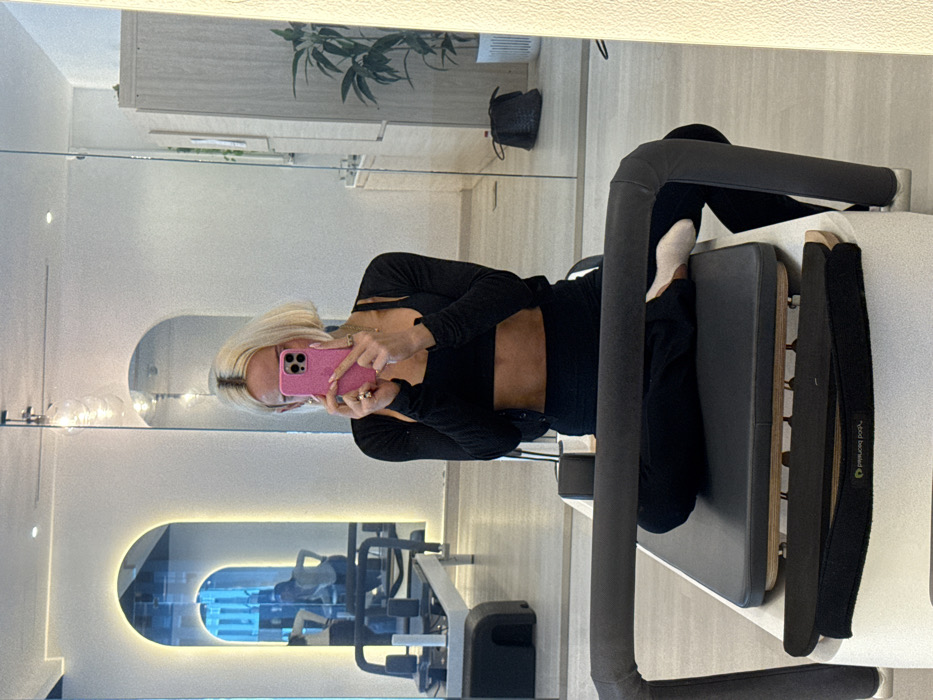 A woman with short blonde hair takes a mirror selfie. She's wearing a black, midriff-baring exercise outfit and holding a pink cell phone. She's sitting on a pilates reformer machine in a bright, minimalist studio. The reflection in the mirror shows other exercise equipment and an arched window with a blue glow. A plant and a black purse sit on a shelf above the mirror.
