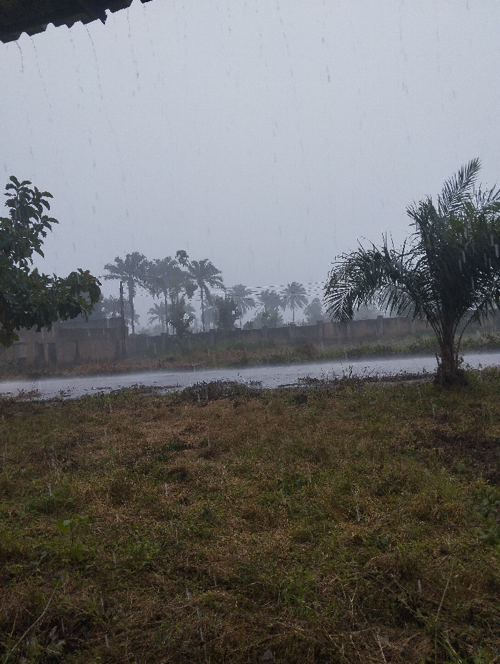 The image depicts an outdoor, rural scene in Kaninkon, Nigeria, during heavy rainfall
