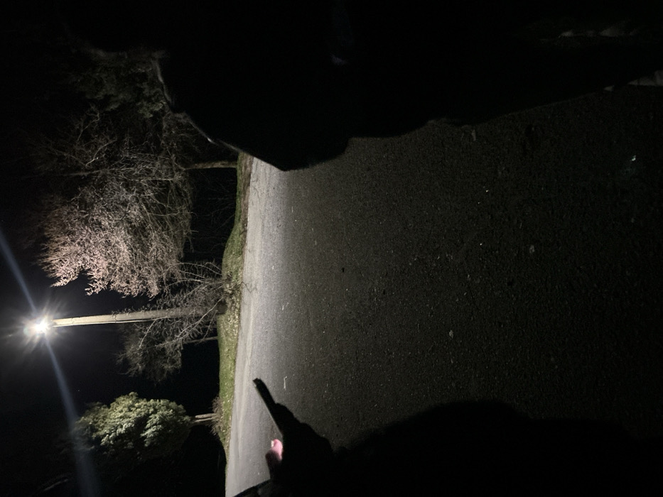 The scene depicts a nighttime outdoor environment in Momchilgrad, Bulgaria. Two individuals are present, largely silhouetted against the darkness. On the left, a person's left hand is visible, holding a smartphone horizontally; the device's screen emits a distinct pinkish light. On the right, the partial silhouette of another individual's upper torso and head is visible, positioned toward the right edge of the frame. The foreground is an asphalt surface, illuminated by a bright streetlamp positioned centrally in the mid-ground. The streetlamp is a single pole fixture with a clear, intense light source. To the left of the streetlamp, a dense, evergreen tree stands on a slight grassy embankment. To the right of the streetlamp, a deciduous tree with numerous visible light-colored buds or early blossoms is present, its branches illuminated by the streetlamp. Further into the background, additional dark trees and foliage are indistinctly visible. The overall impression is an evening or night setting illuminated artificially.