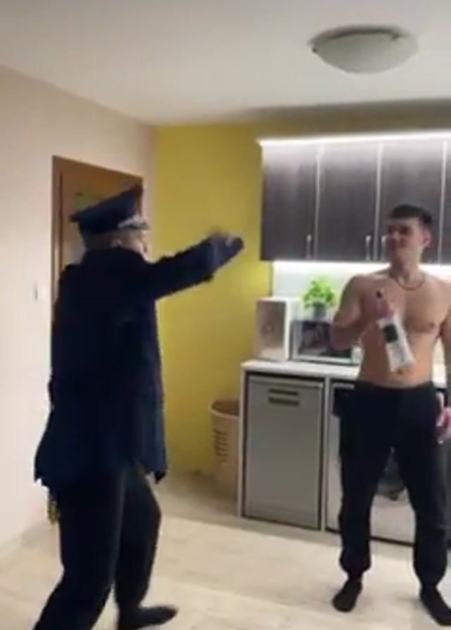 In a well-lit room with light-colored tile flooring, a man dressed in a dark blue police uniform places handcuffs on a shirtless man holding a clear bottle with a white label. The room is furnished with a washing machine, dishwasher, kitchen cabinets, microwave, and speaker. The police officer is wearing a hat, and the shirtless man is wearing black pants. The wall behind the cabinets is yellow. The two men are moving erratically as the officer handcuffs the shirtless man.