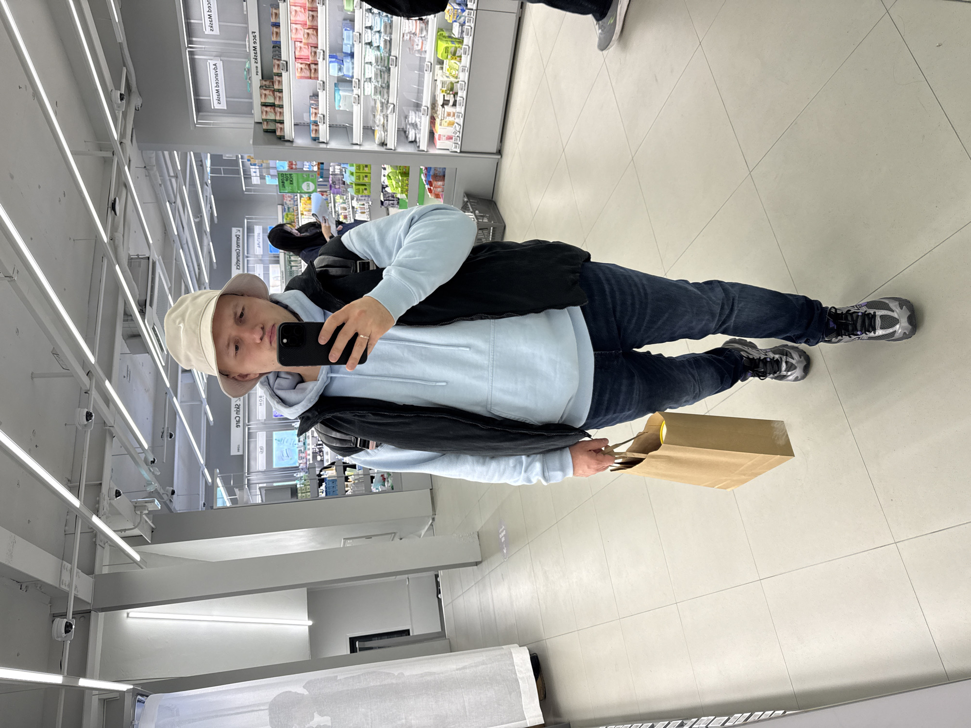 A person wearing a beige bucket hat, light blue hoodie, black vest, dark jeans, and grey running shoes stands in a brightly lit commercial space, holding a smartphone in their right hand, presumably taking a selfie. In their left hand, they hold a brown paper bag. Shelves filled with various products line the left side of the frame, suggesting a store setting. The overhead lighting consists of long, linear fluorescent fixtures. The floor is tiled in a square pattern. The presence of products typically found in drug stores and the architecture are consistent with retail spaces in urban environments, which could potentially be in Busan, South Korea.