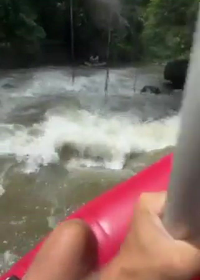 A first-person perspective video shows someone white-water rafting down a lush, green river