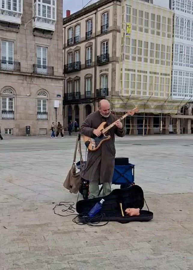 street performer playing an electric bass guitar in a large, open town square. The man is middle-aged, with a bald head and a short beard. He wears a long, dark brown coat over light-colored pants. He stands in the center of the square, with his musical equipment around him. There is a bag on the ground near his feet, an open guitar case with what appears to be a mannequin head inside, and a blue amplifier behind him. Buildings surround the square. The buildings are old with multiple windows, many with balconies. Several people can be seen walking in the background, and a bus passes by behind the musician. The square is paved with light-colored stones. The sky is overcast.
