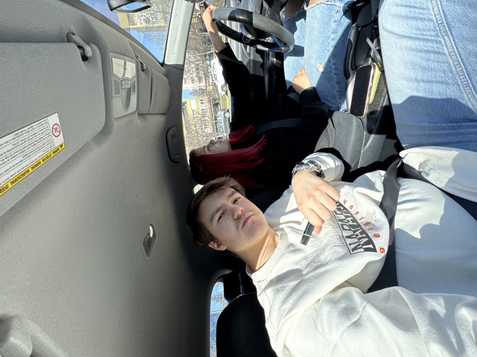 Two individuals are observed inside the passenger compartment of a vehicle during daylight hours
