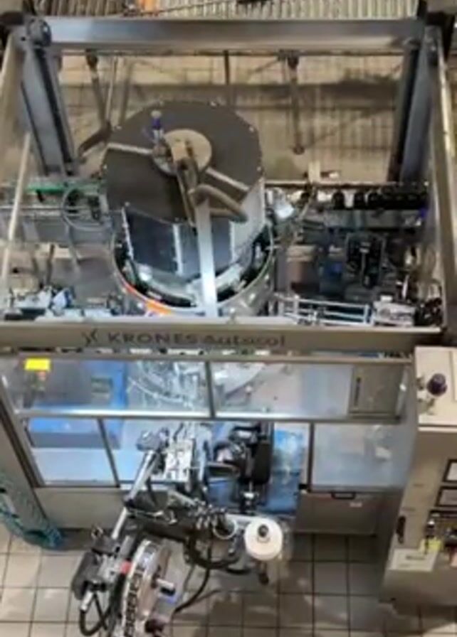 n automated labeling machine in operation. The machine, labeled “Krones Autocol,” is applying labels to bottles that are moving along a conveyor belt. The machine has various mechanical components, including rotating discs, rollers, and application arms. The bottles enter the machine, receive labels, and continue along the conveyor belt. The environment appears to be a factory or manufacturing facility, indicated by the tiled floor and overhead conveyor systems. No people are visible in the video.