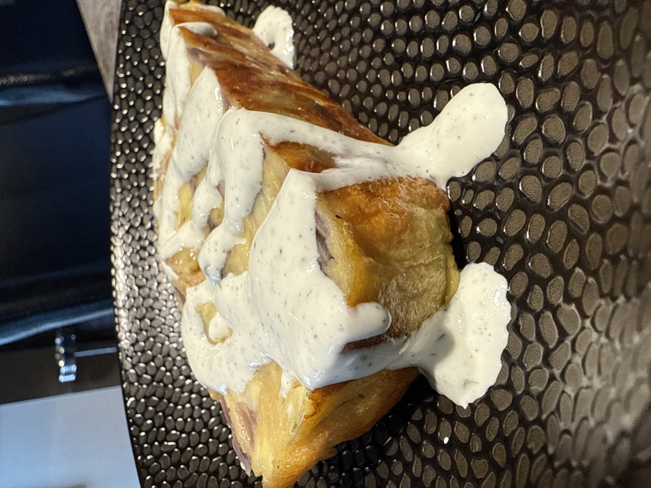 A rectangular portion of a baked savory dish, possibly a gratin or tart, is centrally positioned on a dark, textured plate in an indoor setting in Budva, Montenegro. The dish exhibits a golden-brown exterior with lighter yellow sections and visible pieces of reddish-purple vegetable, likely red onion. A thick, opaque white sauce, characterized by small, dark granular inclusions, is generously drizzled over the top surface and has flowed down the sides, accumulating slightly on the plate. The plate itself is dark, likely black or dark grey, featuring a distinct, repeating pattern of raised, rounded indentations or bumps. The background is out of focus, showing dark, indistinct shapes consistent with interior furnishings, possibly a dark chair back and a surface. No individuals or specific actions are discernible beyond the presentation of the food.