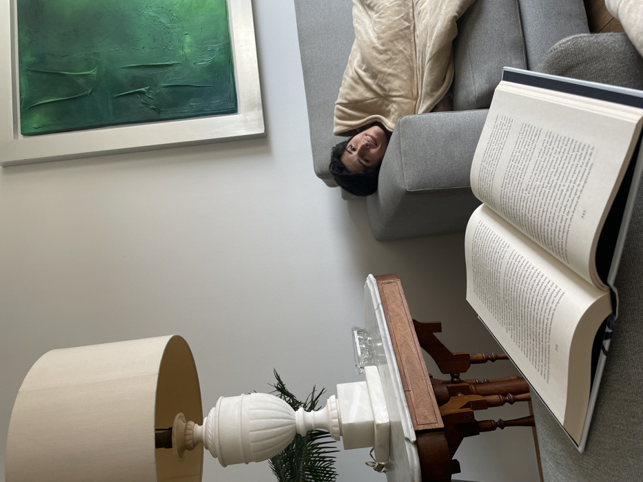 A person under a tan blanket rests on a gray sofa. Next to them is an open book with a black cover, the pages displaying text. A small table with a lamp and a decorative plant sits adjacent to the sofa. Above, a framed green abstract painting hangs on the wall. The room has white walls.