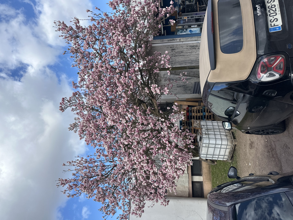 The image displays an outdoor scene in Neuilly-Plaisance, France, under a sky with scattered white clouds against a blue background. A large, deciduous tree covered in numerous pink blossoms, indicative of a magnolia, occupies the central and upper portions of the frame. Its branches extend horizontally across the scene. In the background, two structures are visible. To the left, a portion of a light-colored building with two rectangular, horizontal windows is present. To the right, an industrial-style building features a weathered, possibly metallic facade and a partial blue sign. Between these structures, beneath the tree, industrial materials are stored: a white, grid-patterned intermediate bulk container (IBC) sits on a wooden pallet, and several stacks of additional wooden pallets are visible. A small area of green grass is present near the base of the left building. Two vehicles are parked on a dirt or gravel surface in the foreground. On the right, a black Smart Fortwo Cabriolet with a beige soft top is angled towards the viewer, displaying its rear section and a French license plate reading "FS-026-S". On the far left, the front-left quarter of another dark-colored vehicle, including its side mirror, is partially visible. No individuals are present in the scene.