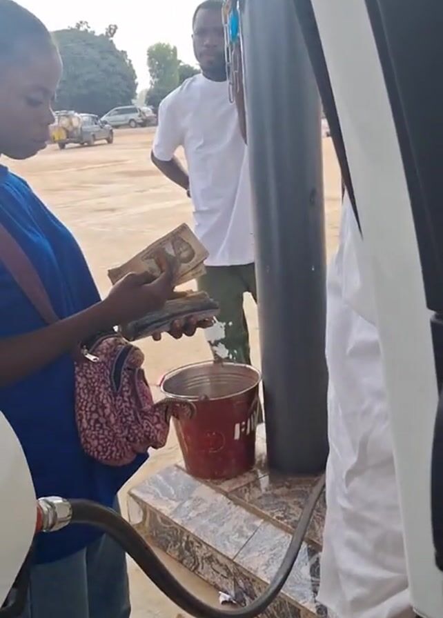 The video depicts a person standing near an open car door and counting money at a gas station. The person is wearing a blue shirt and jeans, and has a patterned purse over their shoulder. They are holding a stack of banknotes. Next to them, on a tiled platform, sits a red bucket with the letters "FFV" printed on it. A black fuel hose leads into the car. In the background, a man in a white t-shirt and patterned pants stands with his hands on his hips, looking towards the camera. To the right of the frame, another person in a white top is partially visible. The car door is black with white trim and a "TOYOTA" sticker is visible on the window. Outside the gas station area, cars are parked and a few trees can be seen. The overall setting appears to be a sunny day.