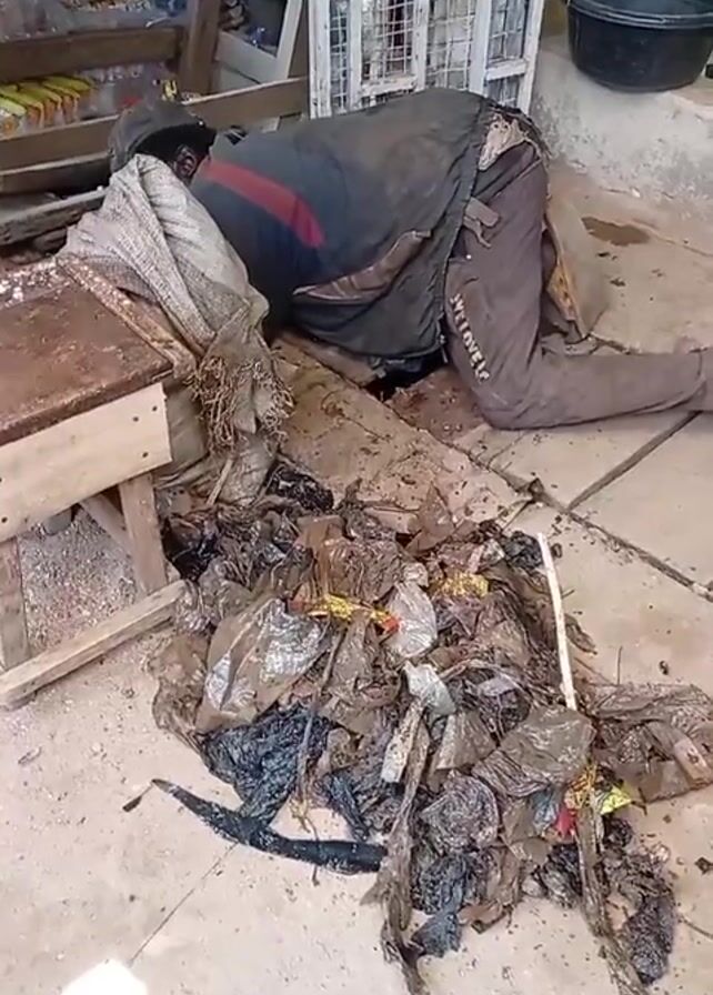 A man wearing a cap and grey clothing is kneeling on the ground searching through a pile of garbage bags. The trash is littered with debris including pieces of plastic and sticks. The man has his head down, facing the trash, and his hands are moving through the refuse. A small wooden table is on the left of the man. Behind him are items including a white metal cage, various pieces of wood, and a black bucket. The setting appears to be an outdoor area near a building.