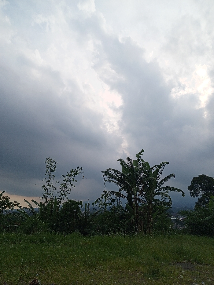 This image captures an outdoor landscape within the city of Thotagamuwa, Sri Lanka. The upper two-thirds of the frame are dominated by a heavy, overcast sky composed of dark grey and white clouds, with brighter patches indicating diffuse light penetration. The lower one-third features a foreground of unkempt green and brown grass covering uneven ground. Immediately beyond the foreground, a dense band of tropical vegetation extends across the midground. Notable elements within this foliage include several tall, slender bamboo-like plants on the left, two prominent banana trees with large, somewhat tattered green leaves situated towards the center-right, and a section of a large, dark green tree canopy on the far right. In the distant background, hazy hills or mountains are visible, beneath which indistinct white and light-colored structures, consistent with a settlement, can be discerned. No individuals, animals, or specific actions are depicted.