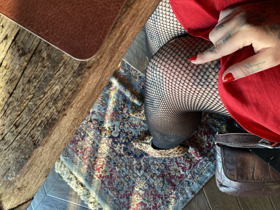 The scene, situated in Ulcinj - Ulqin, Montenegro, depicts an overhead view of a person's lower body within an indoor environment. The individual's legs are encased in black fishnet stockings. A leopard-print, pointed-toe shoe is visible on the left foot. A red garment covers the lap. The left hand, featuring red nail polish and visible finger tattoos, rests on the right thigh, with the index finger slightly extended. A dark brown leather shoulder bag is partially visible to the lower left. The floor features a fringed, ornate rug with patterns in blue, red, and gold, positioned on light-colored tiled flooring. A rustic, textured wooden surface occupies the upper frame, adjacent to a smooth brown surface. Strong, natural lighting casts distinct shadows across the scene.