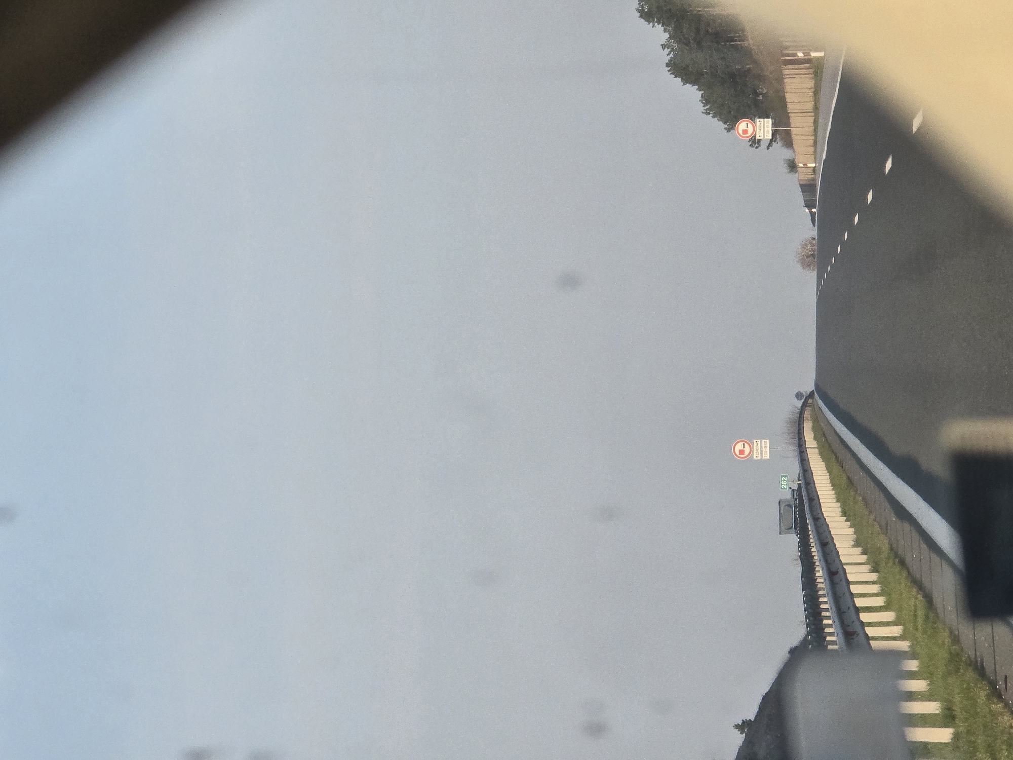 The image captures a scene from within a vehicle on a multi-lane highway in Polsko Padarevo, Bulgaria. The asphalt road, marked with a continuous white line on the left shoulder and dashed white lines for lane separation, ascends over a gentle crest under a pale blue sky. On the left side of the road, a metal guardrail with white vertical posts and horizontal silver rails borders a grassy shoulder, beyond which a vegetated embankment rises. A green highway sign with the number "262" is visible above the guardrail in the mid-ground. A circular red and white prohibition sign is also present on the left, displaying text indicating a weight restriction (≥ 22,400 kg) and a time restriction (7:00-19:00). On the right side of the road, a similar circular red and white prohibition sign is clearly visible, displaying the same weight and time restrictions (≥ 22,400 kg, 7:00-19:00). Beyond this sign, a concrete or wooden retaining wall is present, followed by an embankment densely covered with evergreen trees. No individuals are visible in the scene. The upper portion of the image contains several dark, circular artifacts, consistent with dust on a camera lens or imperfections on a windshield. A blurred, light-colored object partially occupies the lower right foreground, suggesting an interior car component.
