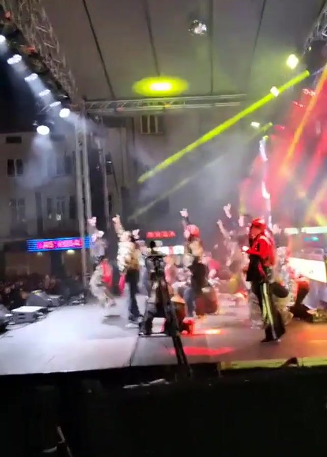 A stage is set up at night for a performance. A group of people, dressed in a mix of camouflage and dark clothing, are dancing on the stage under bright, colorful lights and smoke effects. Some audience members are visible in front of the stage. A camera and its tripod are set up in the middle of the stage, possibly recording the performance. Buildings are visible in the background behind the stage, with some signs lit up.