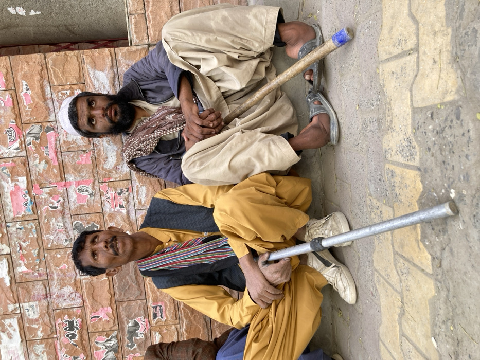 - "Two adult males are depicted seated cross-legged on a paved ground surface, leaning against a reddish-brown brick-tiled wall in Quetta City Tehsil, Pakistan" by FM-7ELnX2, licensed under CC BY 4.0