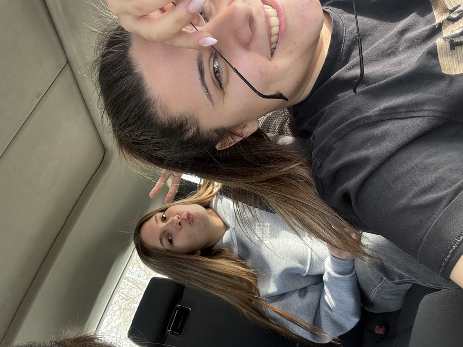 The scene depicts two young adult females inside a vehicle, likely a car, in Radinovo, Bulgaria. The foreground subject, positioned to the right, has dark hair tied back, is wearing a dark short-sleeved t-shirt, and is smiling broadly. Her left hand holds a pair of dark-framed glasses resting on her cheek. Her fingernails exhibit a pink-to-white ombré manicure. The background subject, seated to the left, has long, straight brown hair and is wearing a light grey hooded sweatshirt with "TRUST ISSUES" printed in white on the chest. She is making a "duck face" with pursed lips and performing a peace sign gesture with her right hand. A third person's dark hair is partially visible on the far left. The vehicle's interior includes a light-colored headliner and dark seat components. Natural daylight illuminates the subjects.